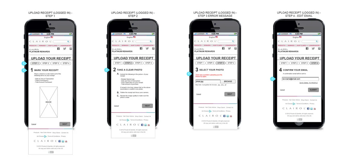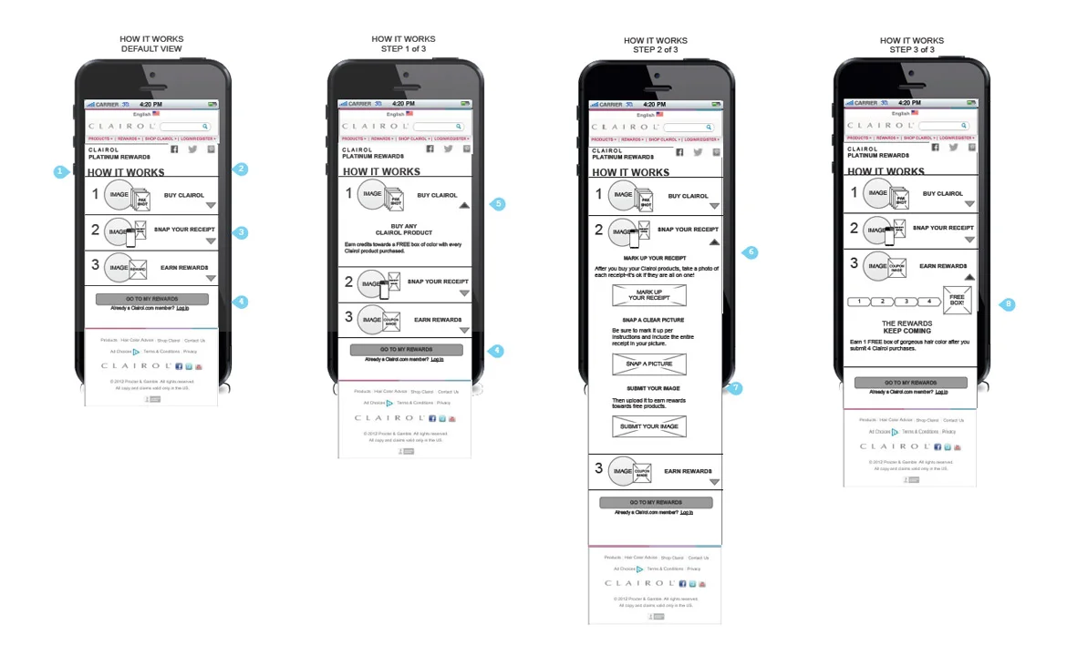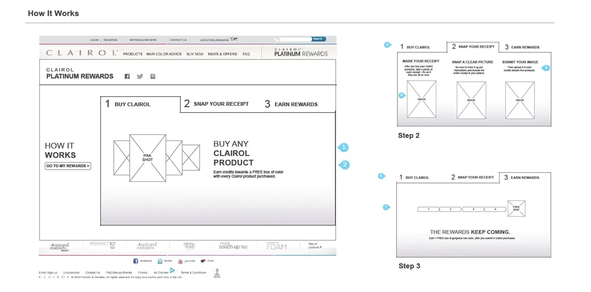 The first ever rewards program offered by P&G on any of their products, the Clairol Platinum Rewards Program served as an internal case study for future programs. It tied together Point of Sale promotions, custom packaging and online experiences. The program consisted of an aggressive "buy 4 get 1 free" offer. Users registered to receive exclusive previews and offers and received a coupon for a free full size product after scanning and uploading their purchase receipts and accumulating points.
