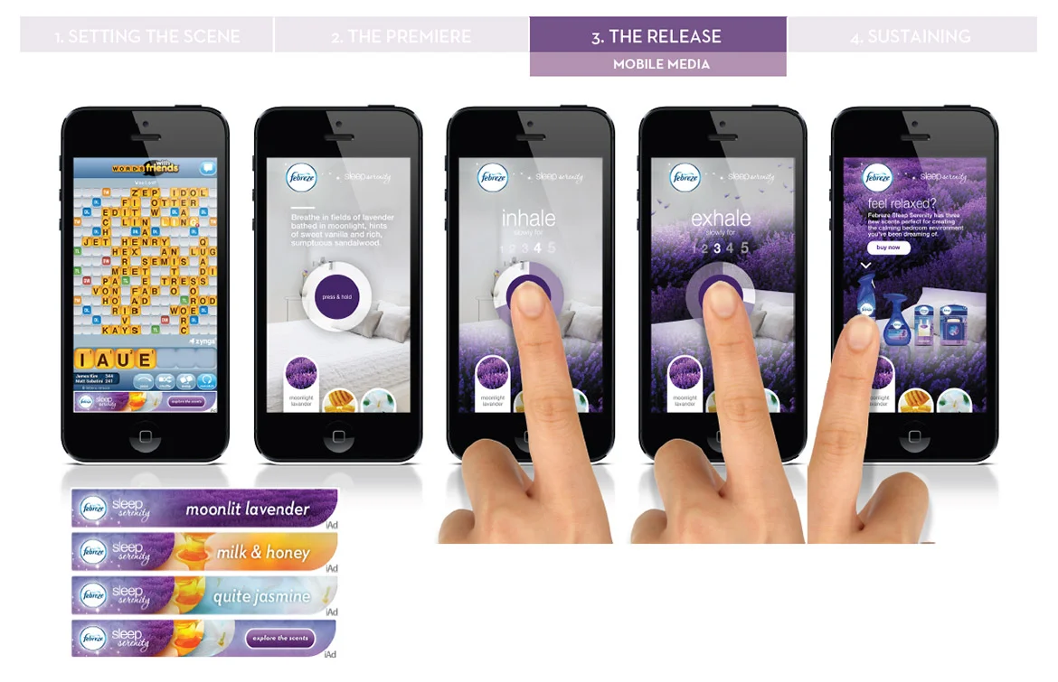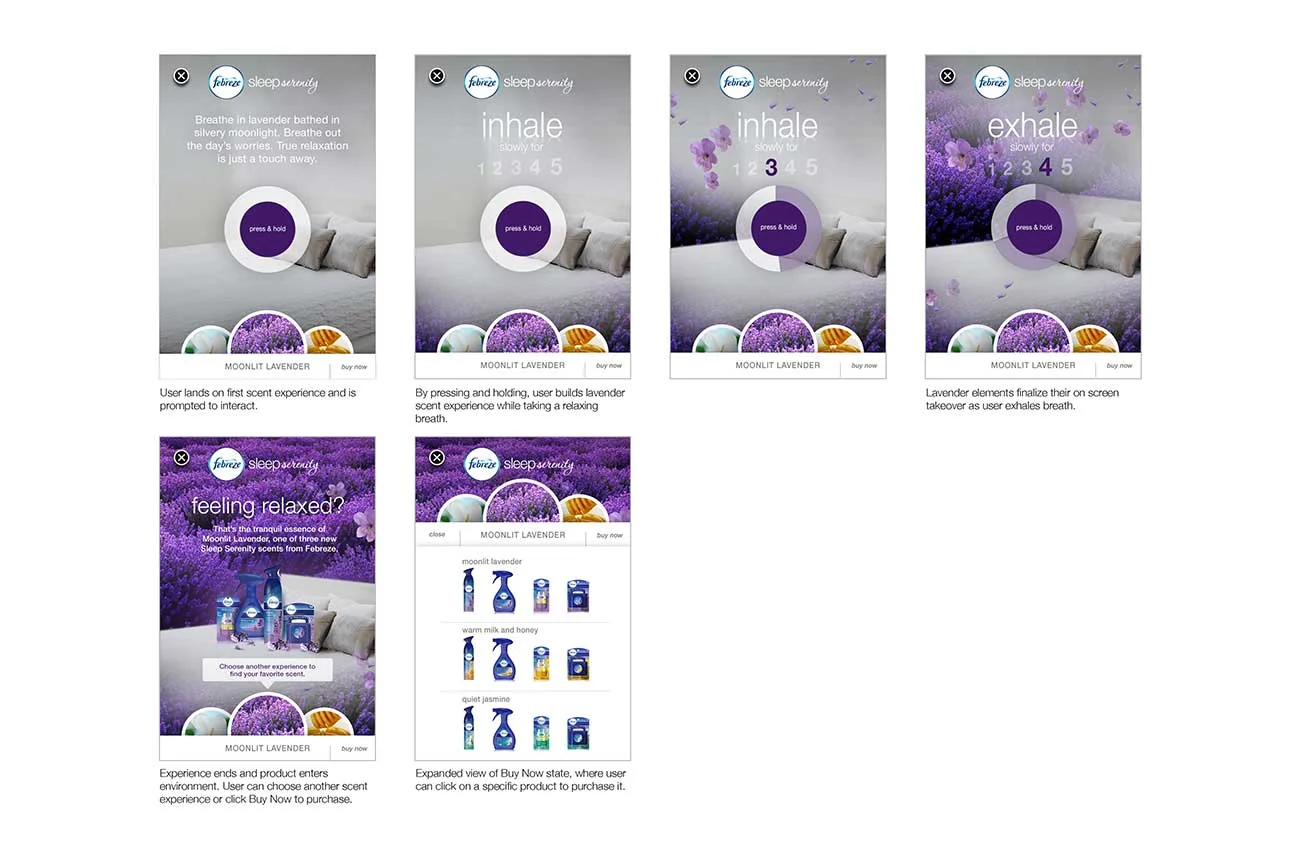 The iAd finds her while she's engaging with her favorite mobile apps while unwinding at nighttime. Then, using wispy animation and scent-cue visuals to catch her eye and engage, we invite her to "Explore the Scents." When she taps the ad, she lands on a crisp clean white bedroom visual and is prompted to experience all three featured scents: Moonlit Lavender, then Quiet Jasmine, and Warm Milk & Honey. She begins by placing her index finger on the prompt. Then text and visuals gently coach her to breathe in and breathe out. Scent cues fill the bedroom scene and her mind will start to calm, infusing her nighttime routine with relaxation and serenity in both the mobile and the real worlds. She is able to toggle between the different scents at any given moment and continue the experience until she's fully relaxed. After approximately 30 seconds, the ad will resolve to two options: Buy Now or Play Again.